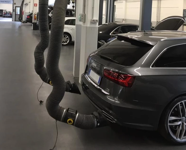 Universal touchless arms that capture exhaust fumes without ever coming into contact with the silencer, and without ever depending on distance and positioning of the vehicle, neither in height, nor in depth or width;